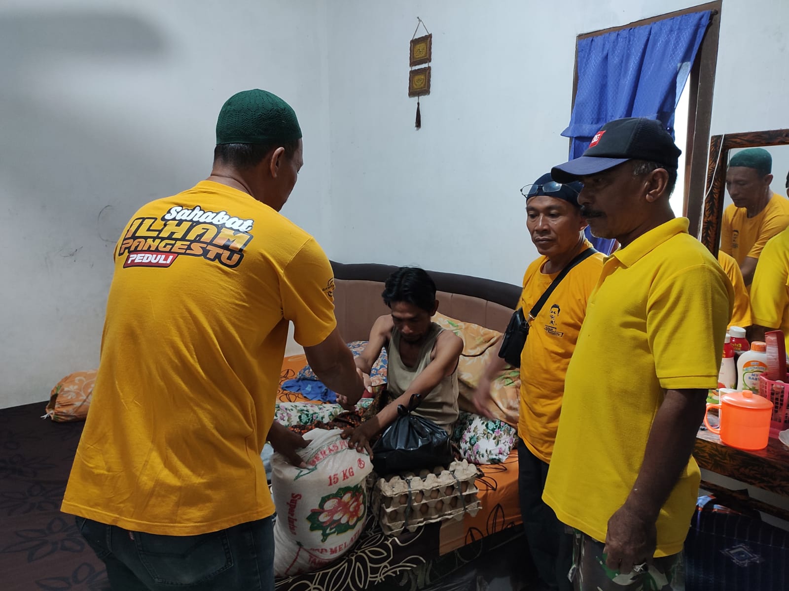 Seketika goni beras yang ada dipundak bung Erdiwan diturunkan perlahan sementara bang Irsan menghulurkan papan telur yang telah terikat rapi. ” Bu, ini ada sedikit bantuan yang diamanahkan oleh Pak Ilham Pangestu uintuk kami sampaikan kepada ibu, mohon diterima ya.?” Ucap bung Erdi.