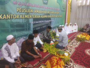 ANN (Aceh Timur) – Keluarga Besar Kantor Kementerian Agama Kabupaten Aceh Timur mengadakan acara Peusijuk (Tepung Tawar) Jamaah Haji di lingkungan Kemenag Aceh Timur Rabu (8/6/2022). Acara pagi 8 Dzulqa’idah tersebut dilaksanakan di aula lantai dua kemenag setempat.