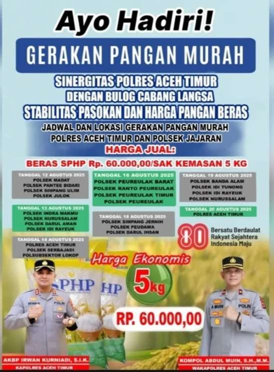 Aceh Timur (ANN) – Kepolisian Resor (Polres) Aceh Timur bekerja sama dengan Bulog Cabang Langsa menggelar Gerakan Pangan Murah (GPM) di 21 kecamatan wilayah hukum Polres Aceh Timur mulai 12 hingga 20 Agustus 2025. Program ini digagas untuk meringankan beban ekonomi warga sekaligus menjaga stabilitas harga pangan menjelang peringatan HUT ke-80 Kemerdekaan RI.